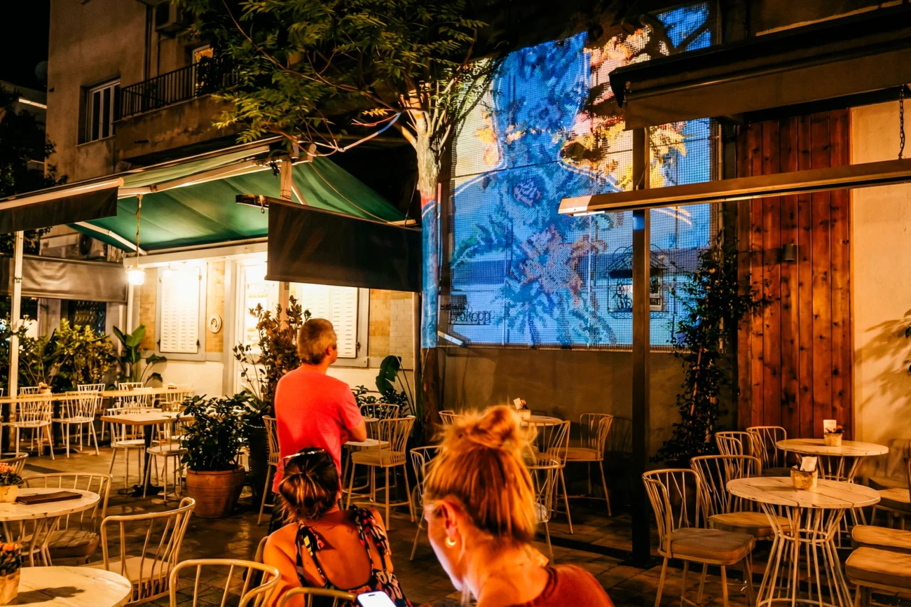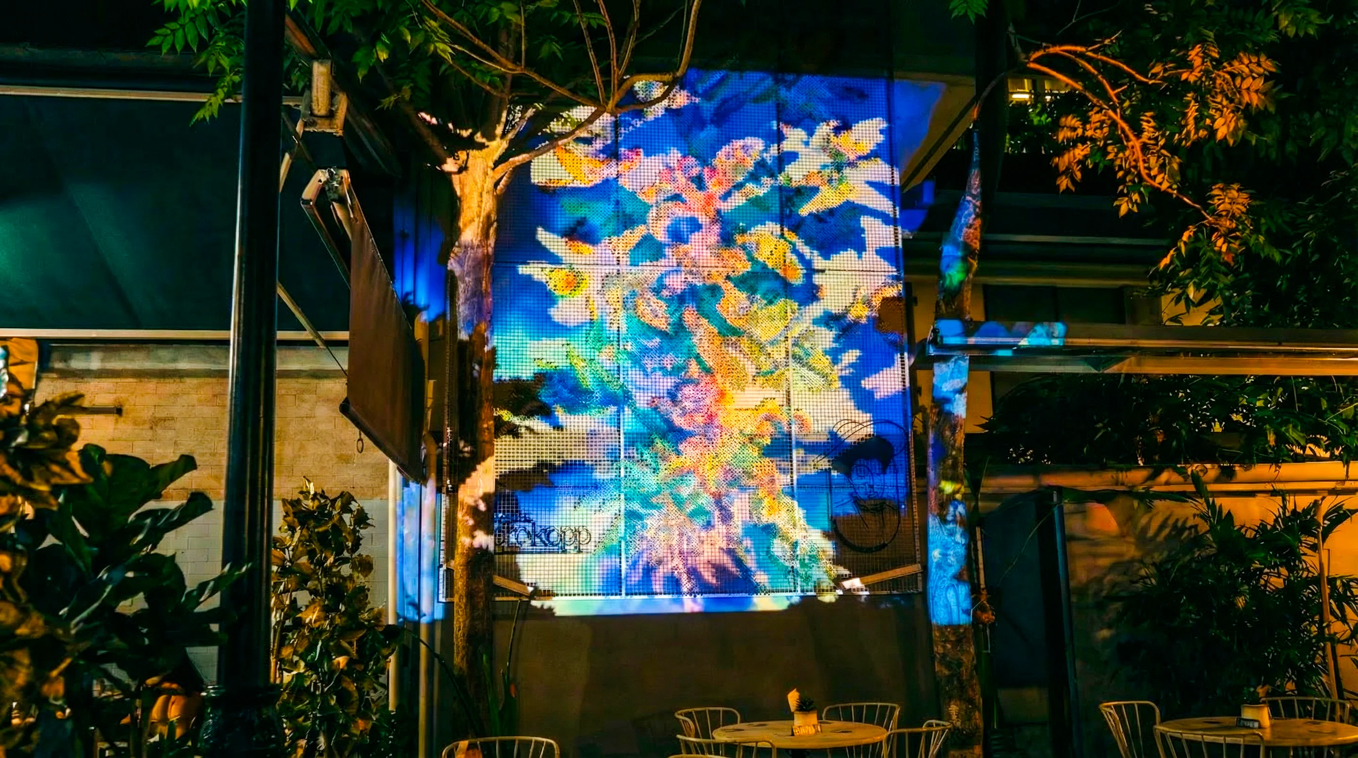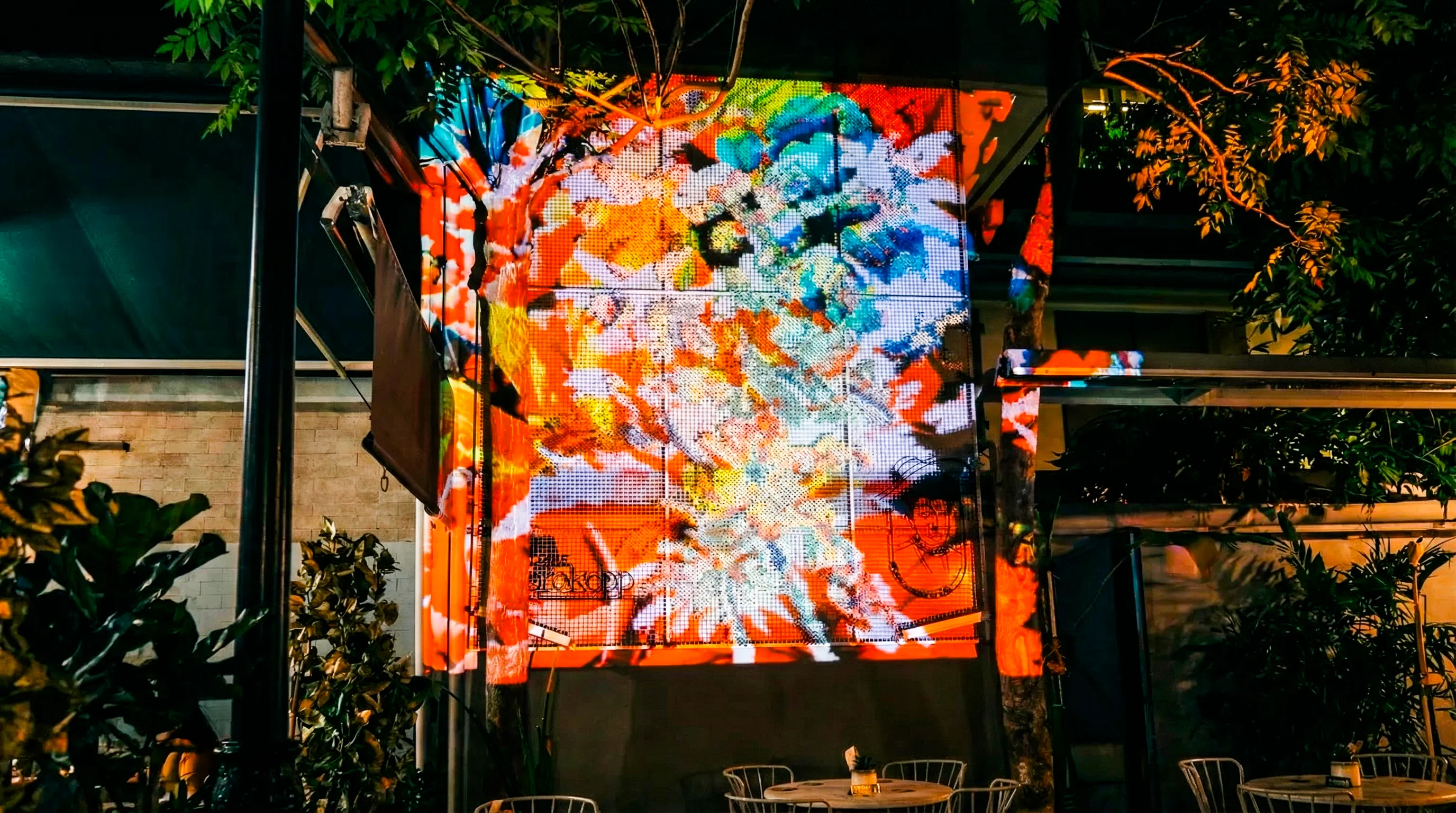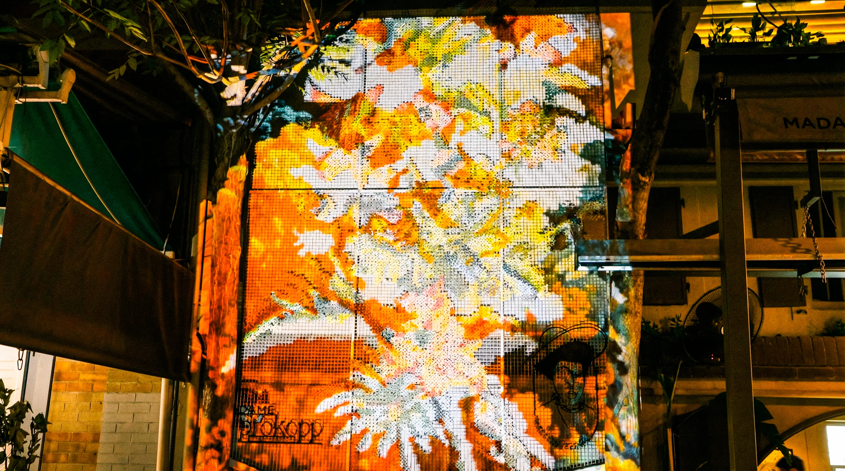 We transformed the facade of Madame Prokopp into a dynamic canvas using specialized projection mapping on a wire mesh grid.